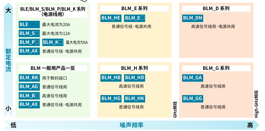 作為電源線的噪聲對(duì)策,支持大電流的鐵氧體磁珠產(chǎn)品陣容齊備。特別是支持最大為20A的BLE32S系列和支持12A的BLM31SN系列等,建議將這些商品用于處理迄今為止的片狀鐵氧體磁珠無法支持的處理大電流的電源電路。此外,作為小型產(chǎn)品陣容,我們還為您準(zhǔn)備了BLM18SP系列。