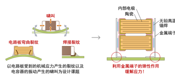 金屬支架電容是通過在外部電極上接合金屬端子來解決大型MLCC貼裝的設計,