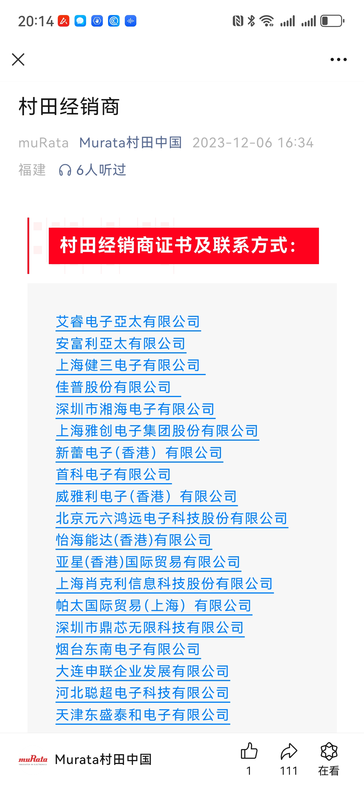 近期我們注意到,市場(chǎng)上出現(xiàn)了眾多自稱是村田murata品牌代理商的情況,這讓大家在尋找合作伙伴時(shí)感到困惑和疑慮。為了維護(hù)您的權(quán)益,讓您輕松識(shí)別真正的村田murata代理商,村田murata官方特別在官網(wǎng)和微信公眾號(hào)上公布了權(quán)威的代理商目錄!