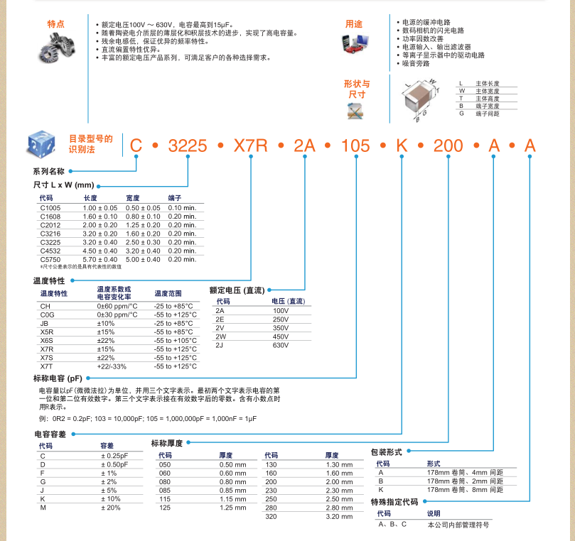 C=系列名稱 3225=尺寸/封裝 X7R=溫度特性/材質(zhì) 2A=額定電壓代碼 105=靜電容量 K=電容容差/精度 200=厚度代碼T AA=包裝后綴