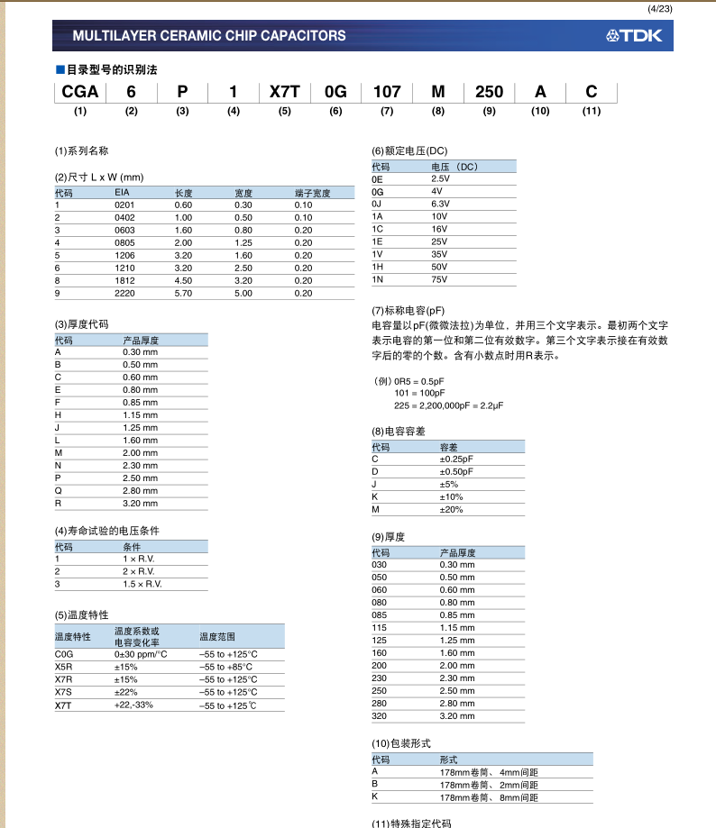 CGA=系列名稱 6=尺寸/封裝 P=厚度代碼T 1=壽命試驗的電壓條件 X7T=溫度特性/材質(zhì) 0G=額定電壓代碼 107=靜電容量 M=電容容差/精度 250=厚度代碼T AC=包裝后綴