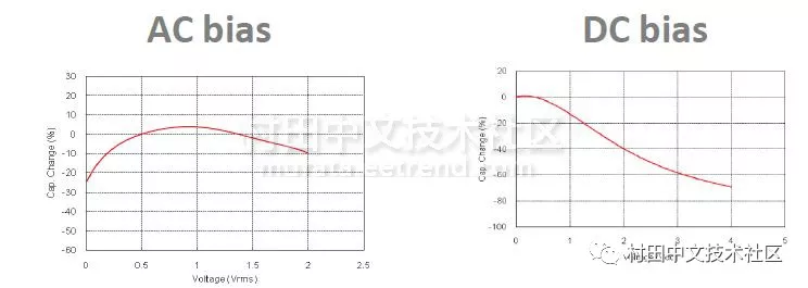 靜電容量隨著施加的交流或直流電壓發(fā)生變化的特性稱為“AC(交流)偏壓特性”和“DC(直流)偏壓特性”,一類材料溫度補償性的AC/DC曲線基本為水平線,二類高介電常數型材料對應曲線如下圖: